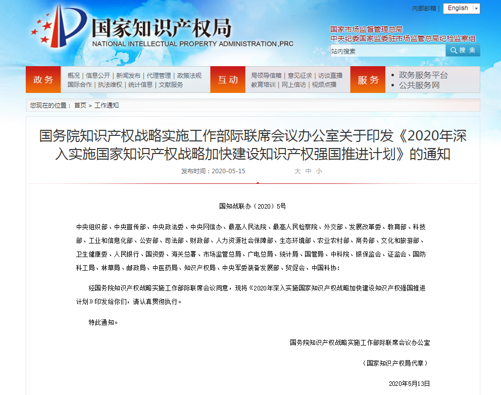 国务院知识产权战略实施工作部际联席会议办公室关于印发《2020年深入实施国家知识产权战略加快建设知识产权强国推进计划》的通知