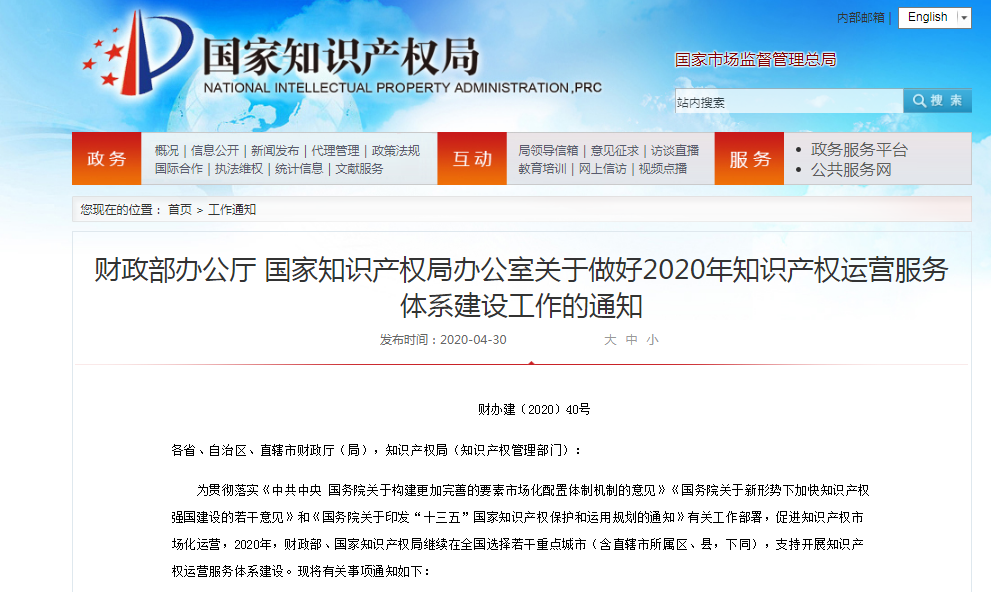 财政部办公厅 国家知识产权局办公室关于做好2020年知识产权运营服务体系建设工作的通知