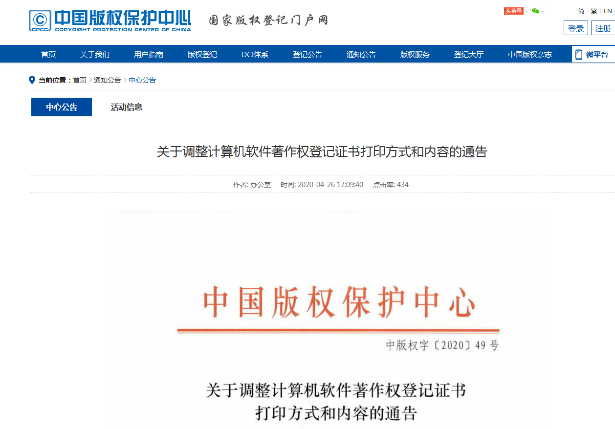 注意:关于调整计算机软件著作权登记证书打印方式和内容的通告