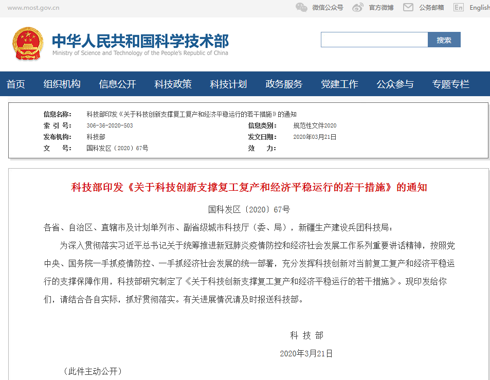 科技部印发《关于科技创新支撑复工复产和经济平稳运行的若干措施》的通知