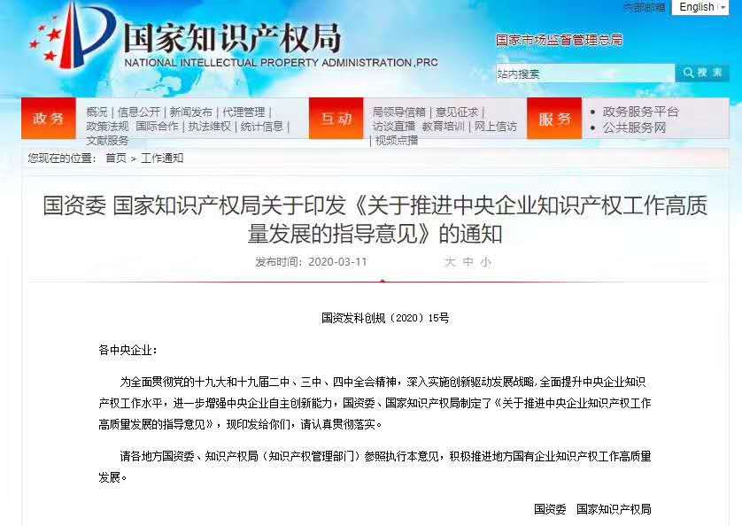 【关注】国资委 国家知识产权局关于印发《关于推进中央企业知识产权工作高质量发展的指导意见》的通知