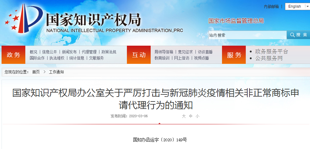 国家知识产权局办公室关于严厉打击与新冠肺炎疫情相关非正常商标申请代理行为的通知