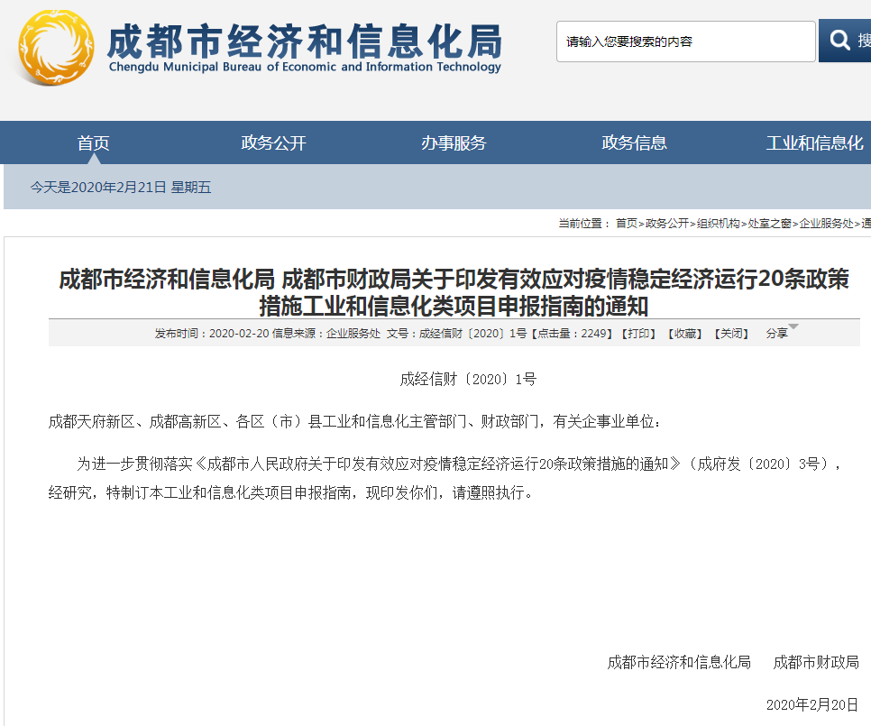 成都市经济和信息化局 成都市财政局关于印发有效应对疫情稳定经济运行20条政策措施工业和信息化类项目申报指南的通知