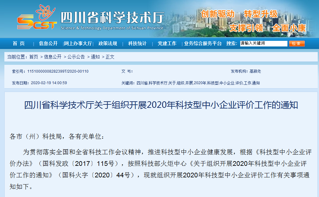 四川省科学技术厅关于组织开展2020年科技型中小企业评价工作的通知