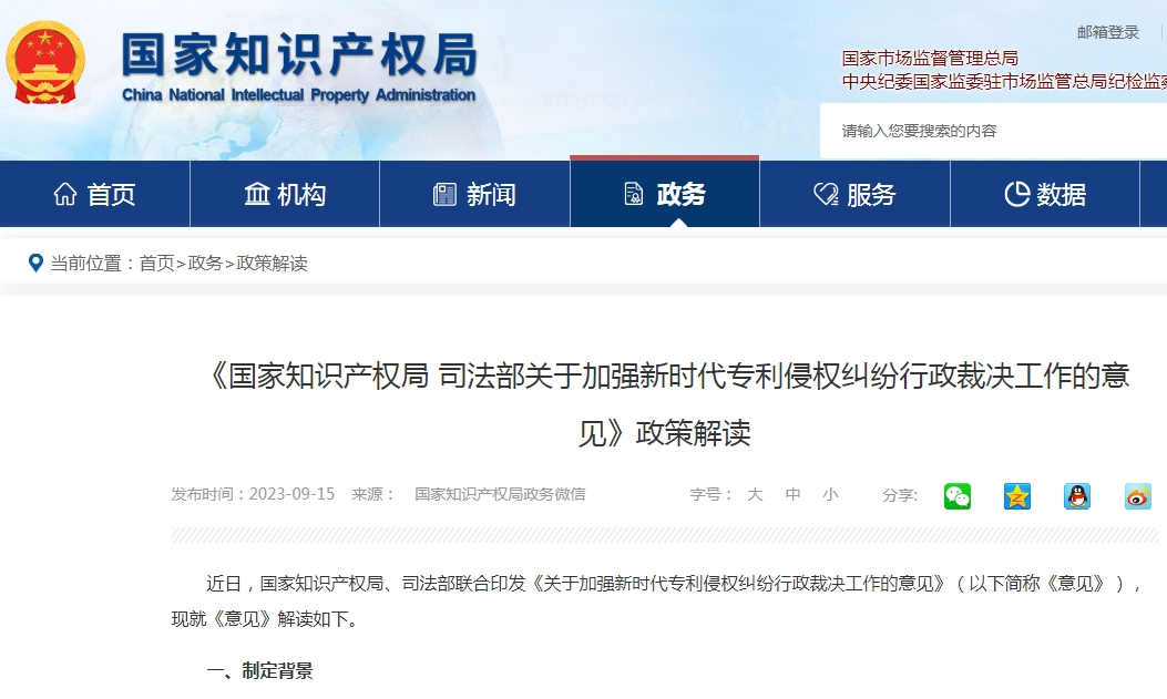政策解读《国家知识产权局 司法部关于加强新时代专利侵权纠纷行政裁决工作的意见》