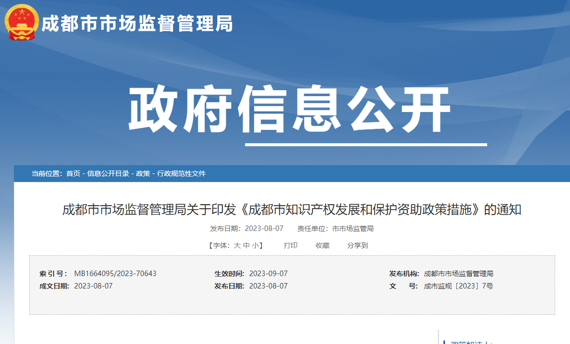 成都市市场监督管理局关于印发《成都市知识产权发展和保护资助政策措施》的通知