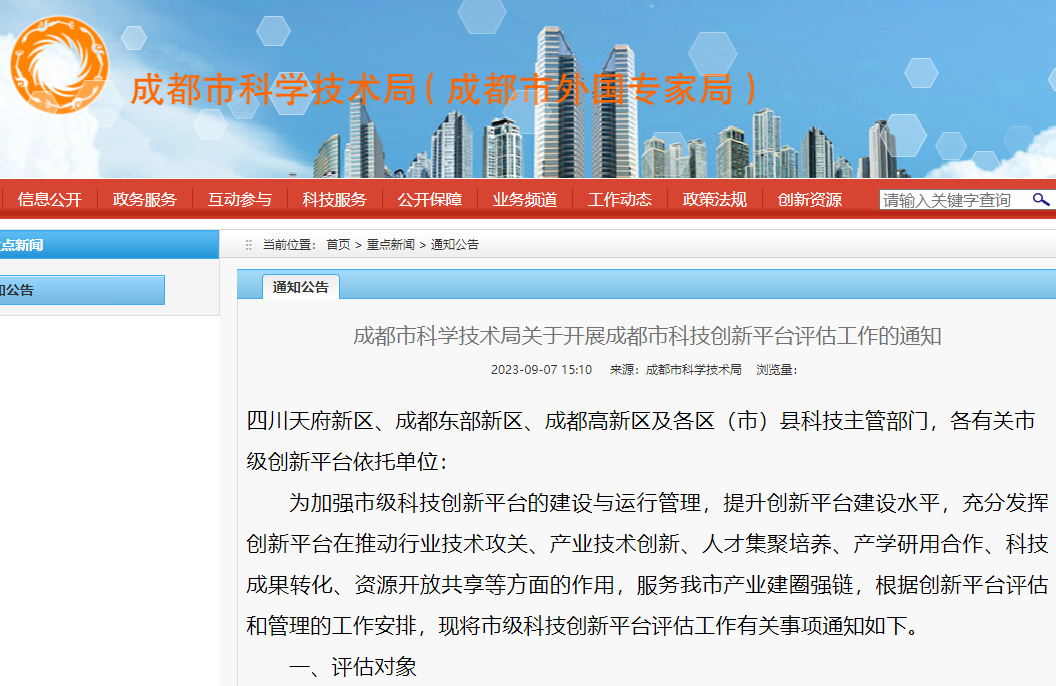 成都市科学技术局关于开展成都市科技创新平台评估工作的通知