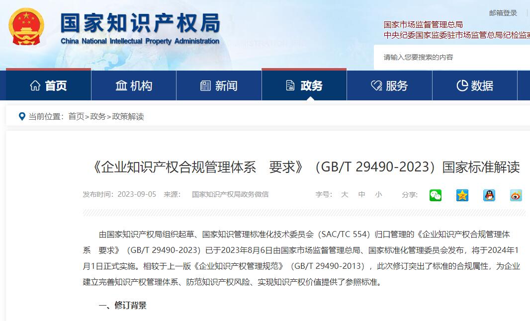 《企业知识产权合规管理体系 要求》(GB/T 29490-2023)国家标准发布
