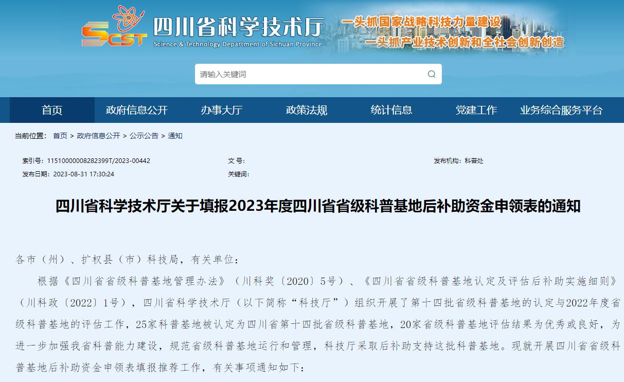 四川省科学技术厅关于填报2023年度四川省省级科普基地后补助资金申领表的通知