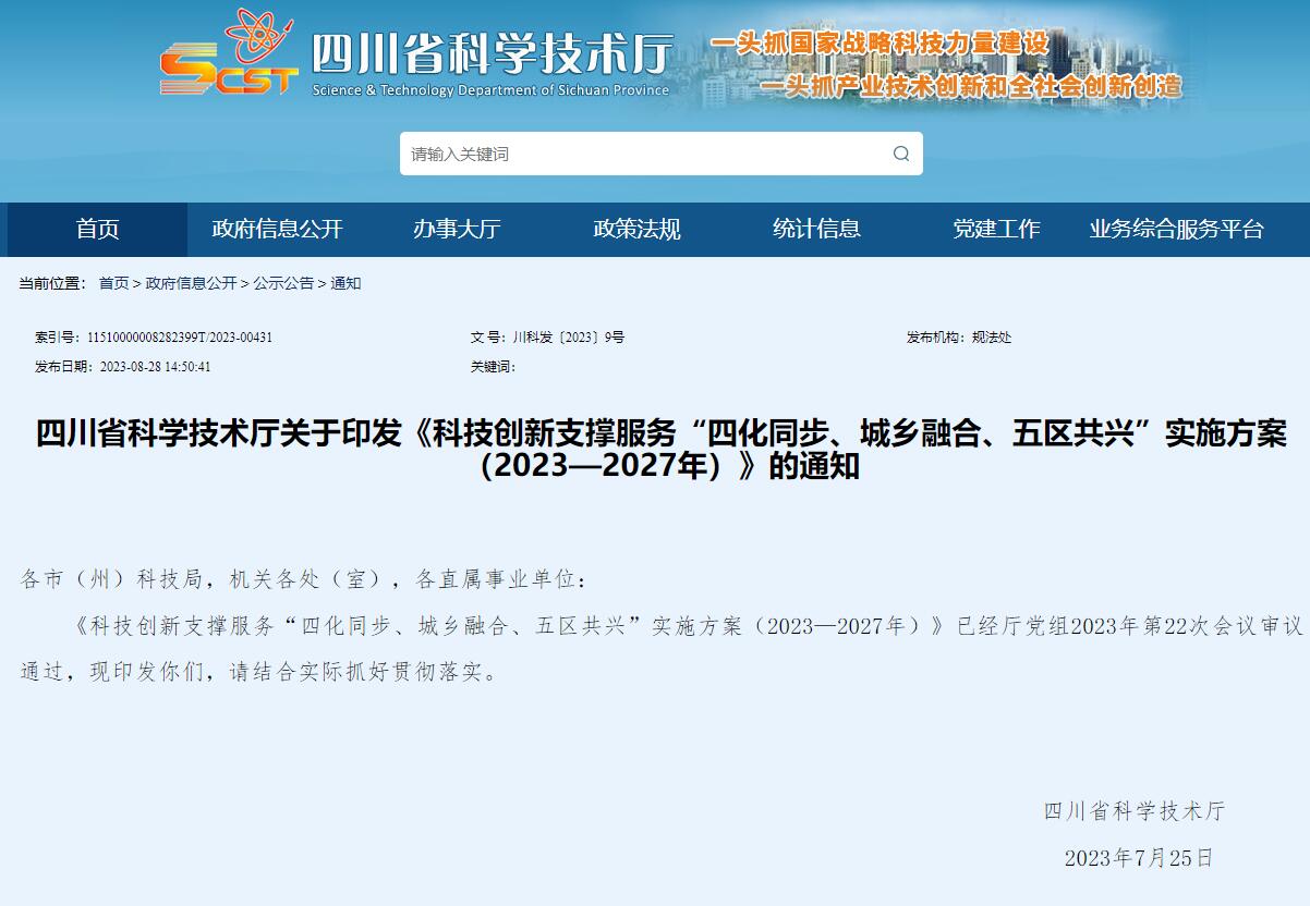 四川省科学技术厅关于印发《科技创新支撑服务“四化同步、城乡融合、五区共兴”实施方案(2023—2027年)》的通知