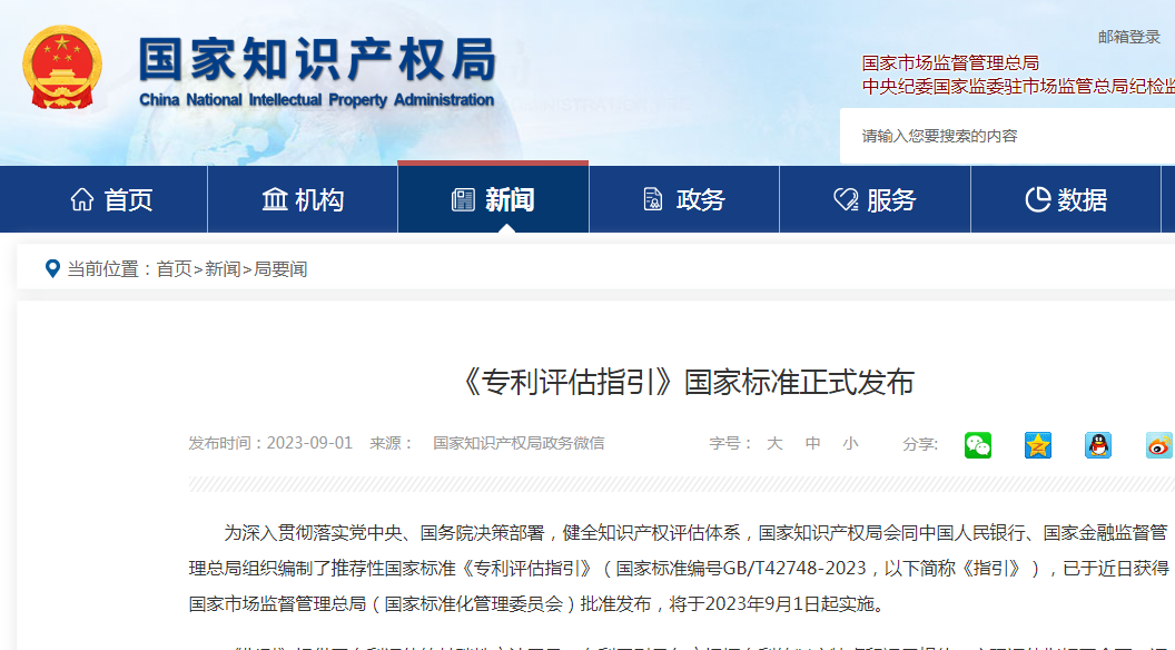 《专利评估指引》国家标准正式发布为深入贯彻落实党中央、国务院决策部署,健全知识产权评估体系,国家知识产权局会同中国人民银行、国家金融监督管理总局组织编制了推荐性国家标准《专利评估指引》(国家标准编号GB/T42748-2023,以下简称《指引》),已于近日获得国家市场监督管理...