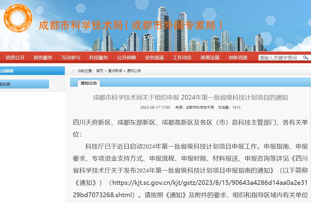 成都市科学技术局关于组织申报 2024年第一批省级科技计划项目的通知