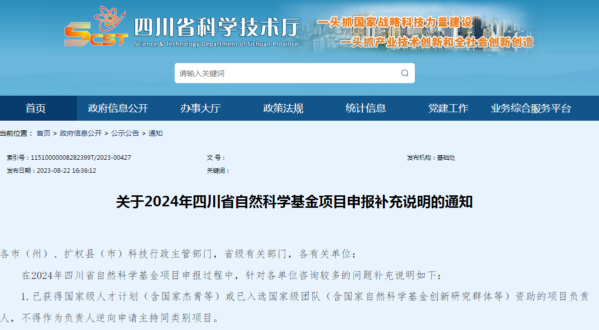 关于2024年四川省自然科学基金项目申报补充说明的通知