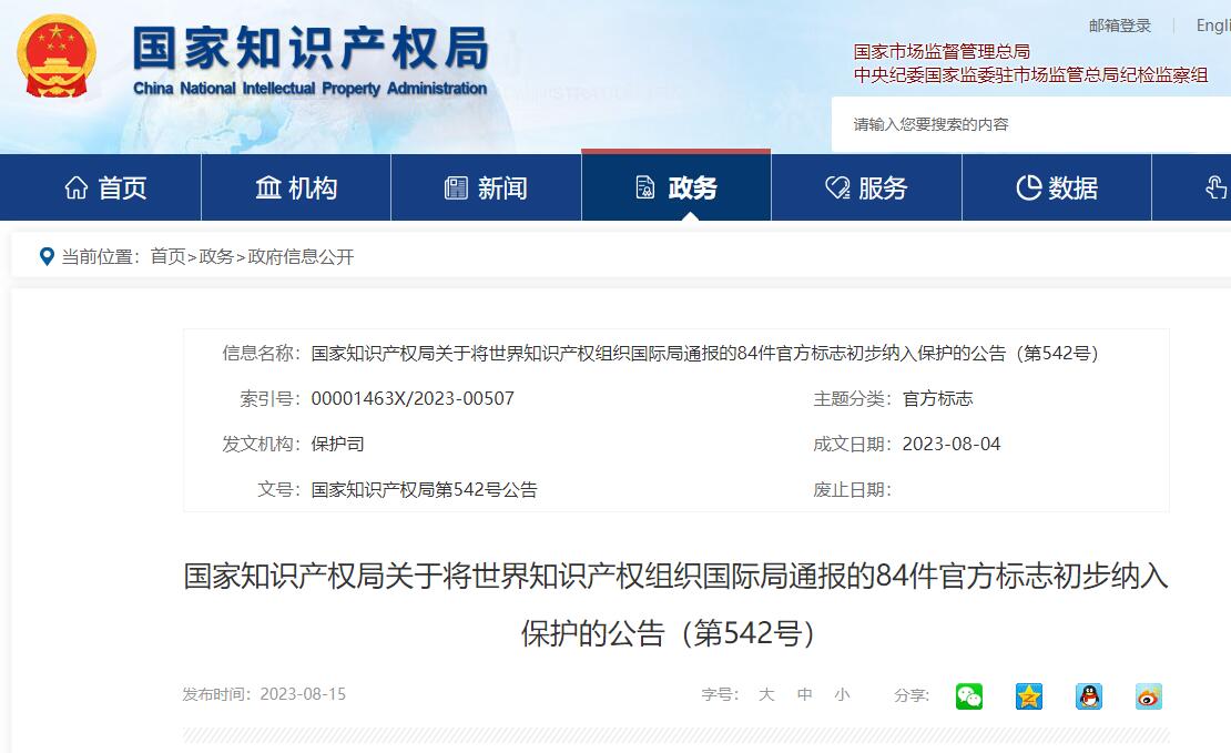 近日,国家知识产权局发布关于将世界知识产权组织国际局通报的84件官方标志初步纳入保护的公告(第542号)。其中提到,为履行我国加入的《保护工业产权巴黎公约》第六条之三,依据《中华人民共和国商标法》第十条第一款有关规定,现将世界知识产权组织国际局于2023年3月31日向中国国家知识产权局通报的84件官方标志初步纳入保护。......