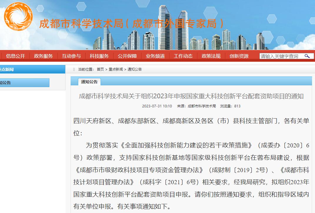 成都市科学技术局关于组织2023年申报国家重大科技创新平台配套资助项目的通知