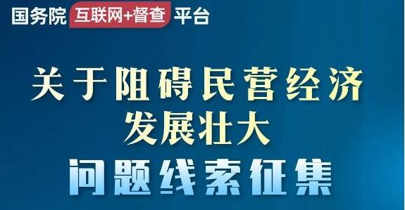 阻碍民营经济发展壮大问题线索征集国务院“互联网+督查”平台为贯彻落实《中共中央 国务院关于促进民营经济发展壮大的意见》,推动解决民营经济发展壮大面临的困难和问题,根据有关工作部署,国务院“互联网+督查”平台从即日起面向社会征集十个方面的问题线索和意见建议。来源:...
