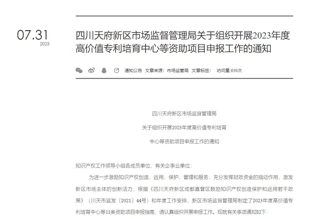四川天府新区市场监督管理局关于组织开展2023年度高价值专利培育中心等资助项目申报工作的通知