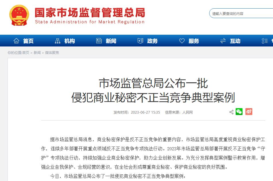 市场监管总局公布一批侵犯商业秘密不正当竞争典型案例