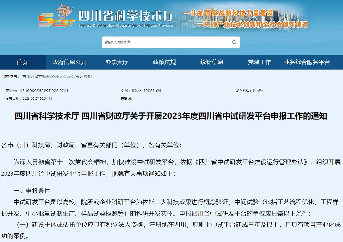 四川省科学技术厅 四川省财政厅关于开展2023年度四川省中试研发平台申报工作的通知