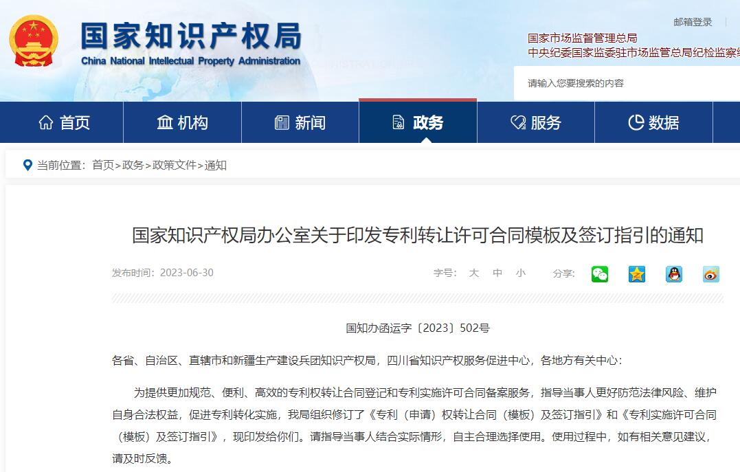 国知局:印发专利转让许可合同模板及签订指引