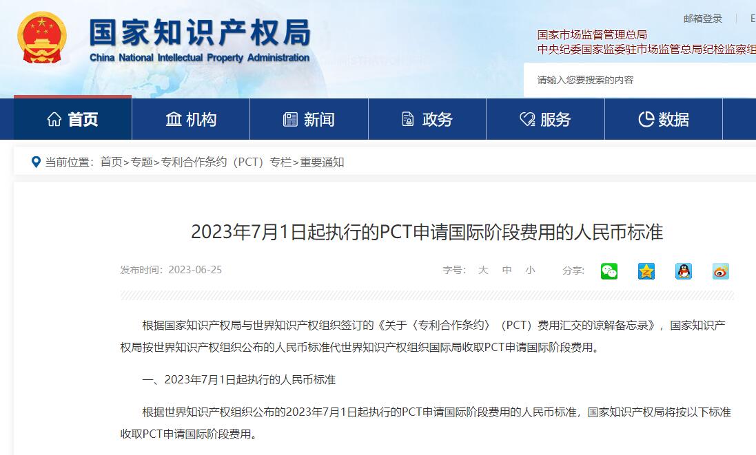 国知局:2023年7月1日起执行的PCT申请国际阶段费用的人民币标准