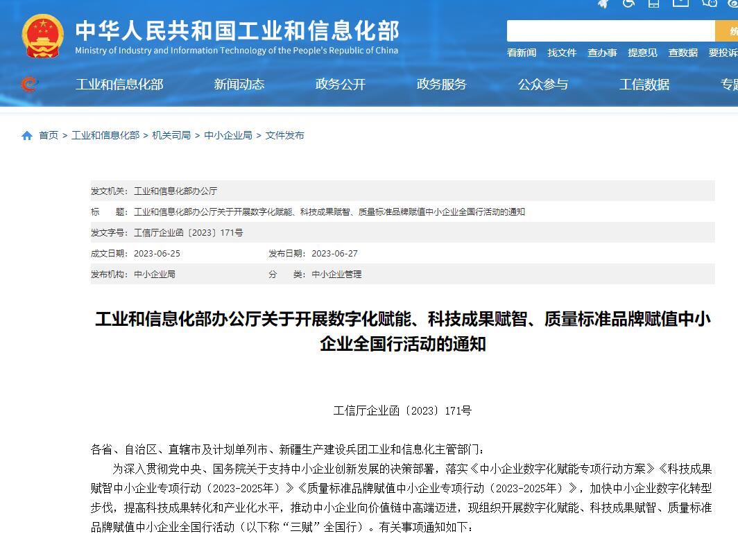 工信部组织开展数字化赋能、科技成果赋智、质量标准品牌赋值中小企业全国行活动