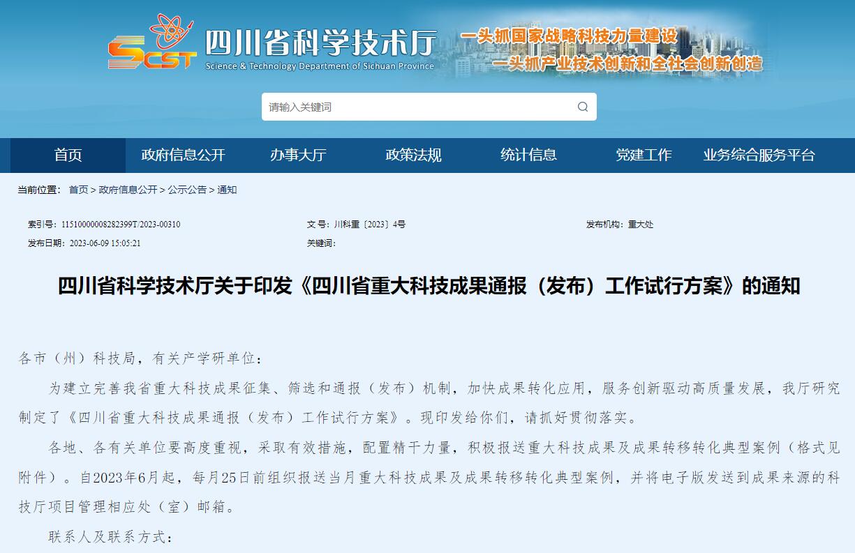 四川省科学技术厅关于印发《四川省重大科技成果通报(发布)工作试行方案》的通知