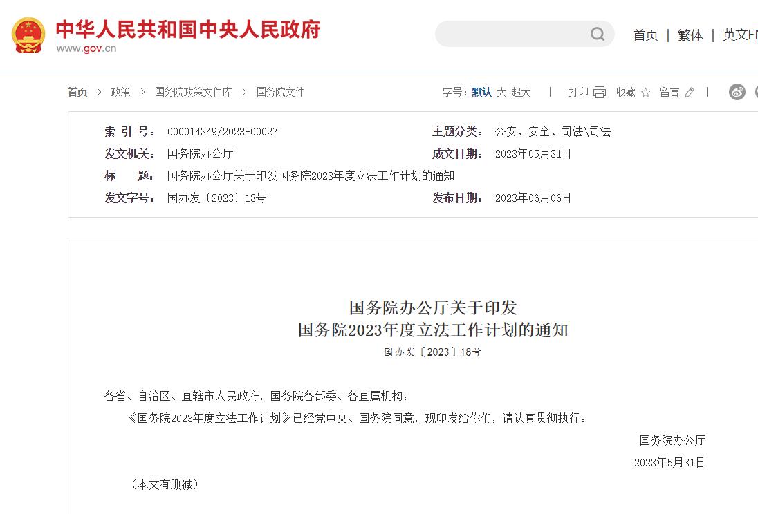 国务院2023年度立法工作计划 |拟审议专利法实施细则(修订)