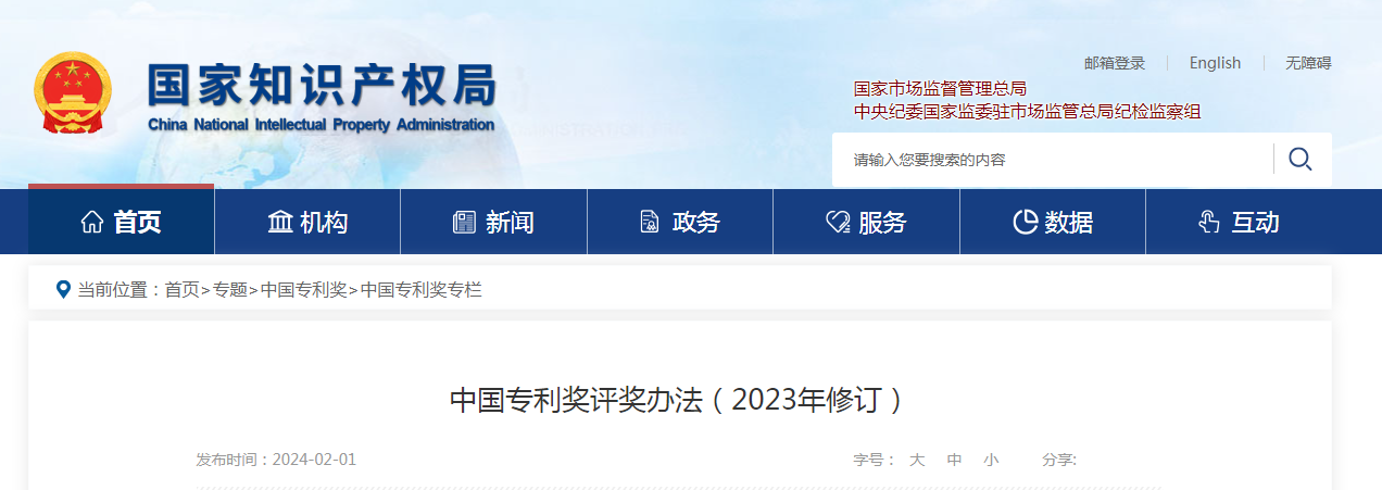 国知局发布《中国专利奖评奖办法(2023年修订)》若获奖项目的专利权被全部无效该奖自动撤销
