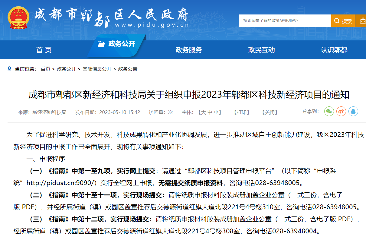 成都市郫都区新经济和科技局关于组织申报2023年郫都区科技新经济项目的通知
