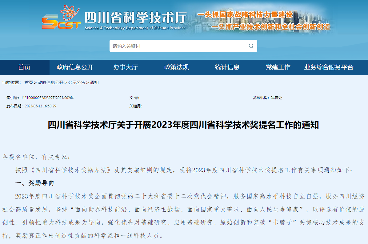 四川省科学技术厅关于开展2023年度四川省科学技术奖提名工作的通知各提名单位、有关专家:按照《四川省科学技术奖励办法》及其实施细则的规定,现将2023年度四川省科学技术奖提名工作有关事项通知如下:一、奖励导向2023年度四川省科学技术奖全面贯彻党的二十大和省委十二次党代会精神,服务国家高水平科技自立自强,服务四川经济社......