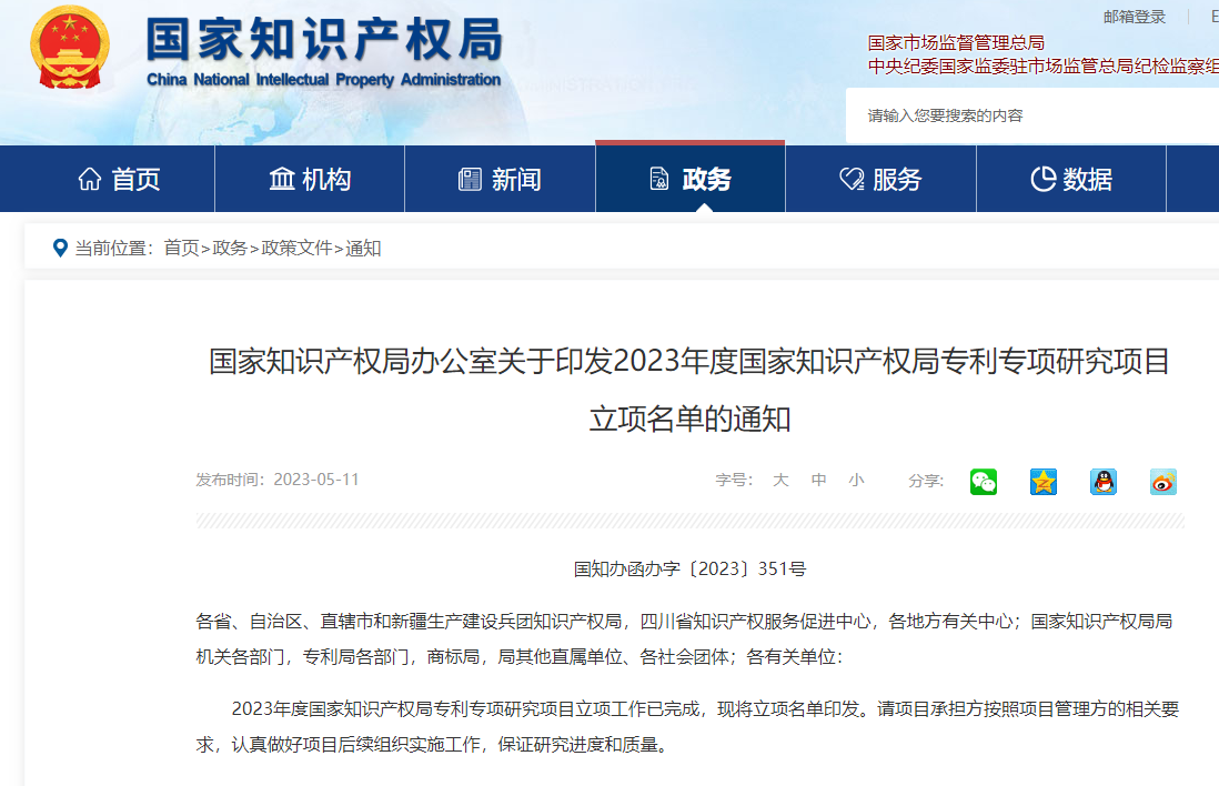 关于印发2023年度国家知识产权局专利专项研究项目立项名单的通知