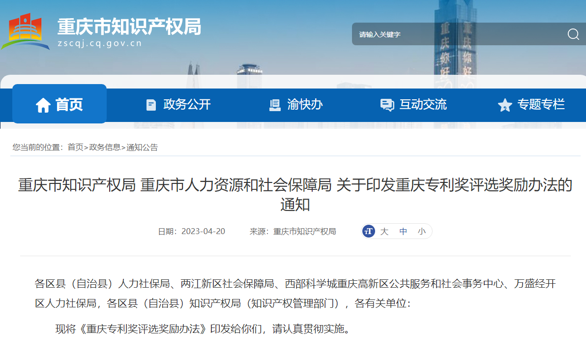 《重庆专利奖评选奖励办法》发布