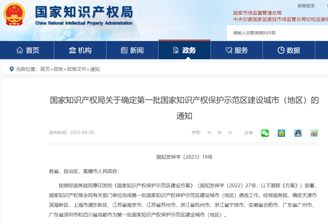 首批国家知识产权保护示范区建设正式启动