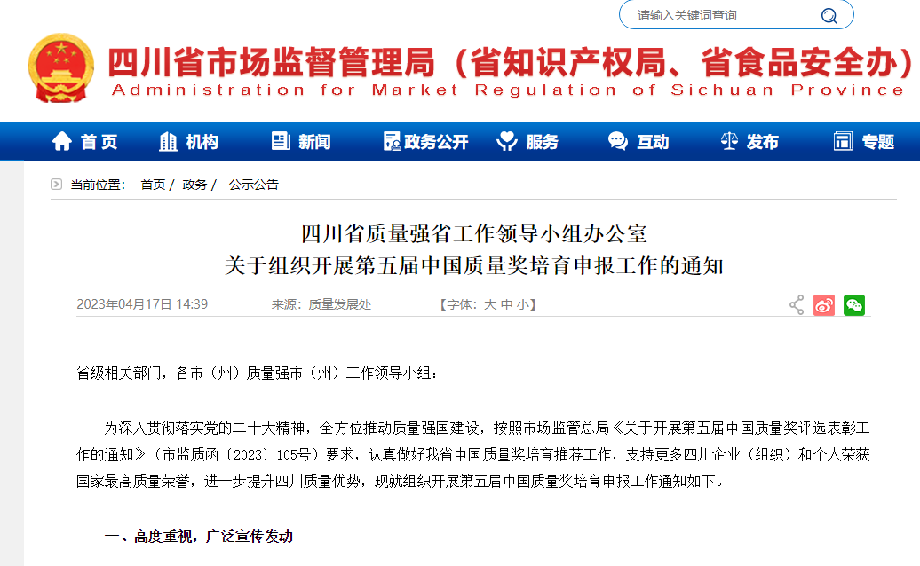 四川省质量强省工作领导小组开展第五届中国质量奖培育申报工作的通知
