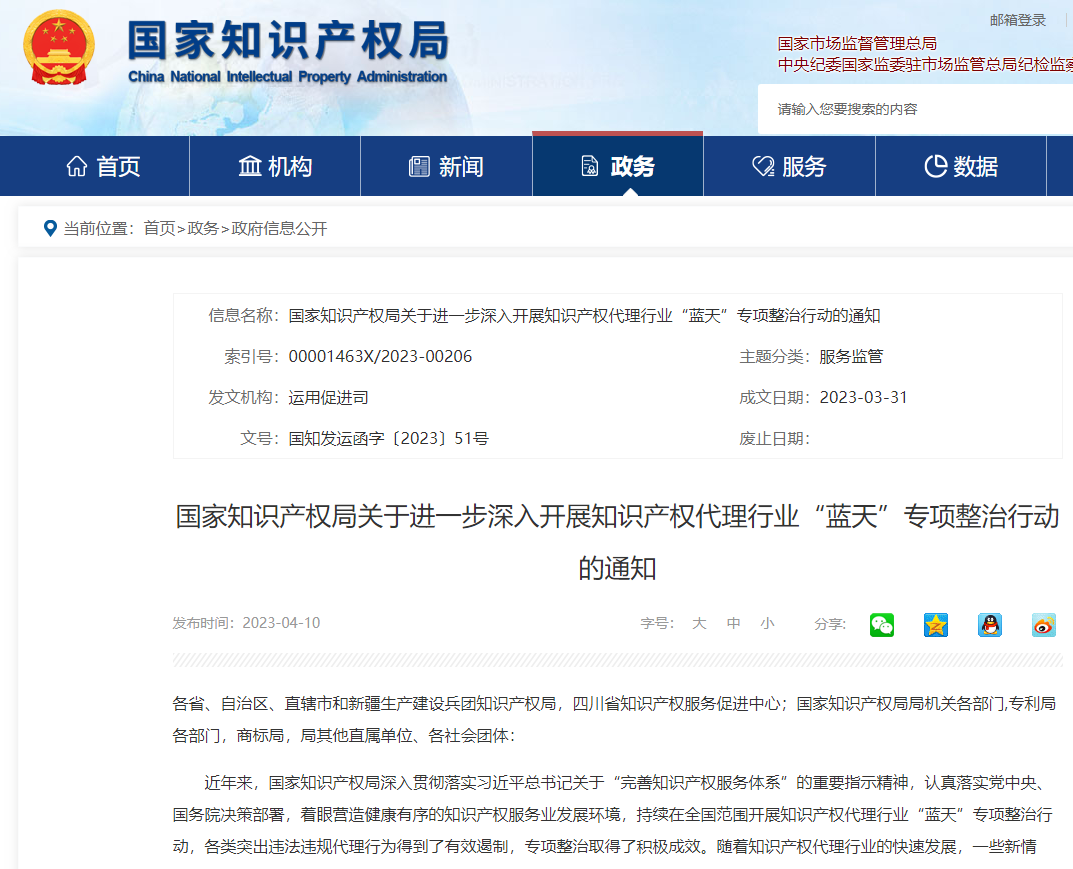 国家知识产权局关于进一步深入开展知识产权代理行业“蓝天”专项整治行动的通知