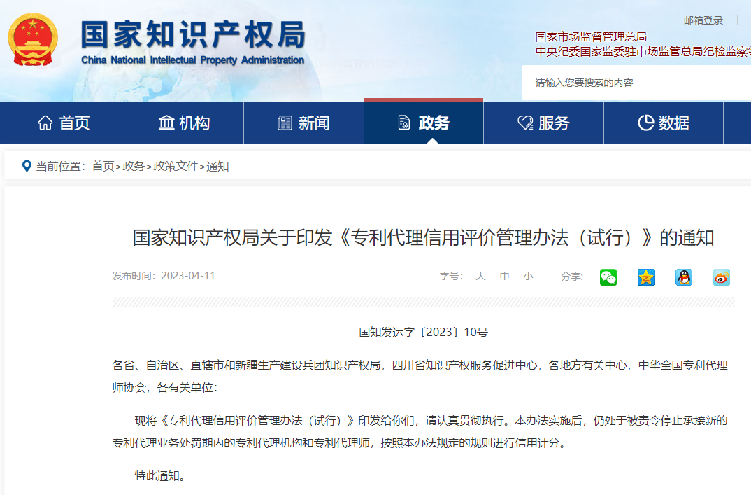 国知局印发《专利代理信用评价管理办法(试行)》本办法自2023年5月1日起试行。