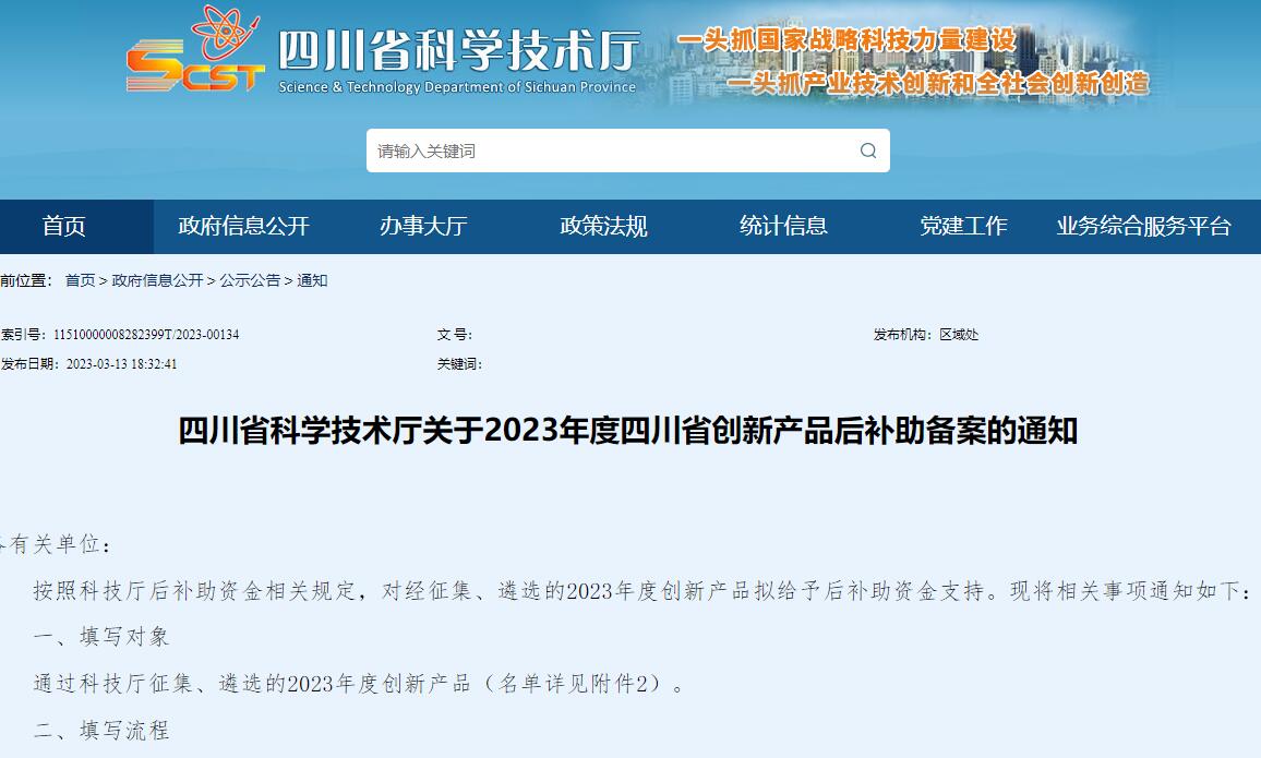 四川省科学技术厅关于2023年度四川省创新产品后补助备案的通知