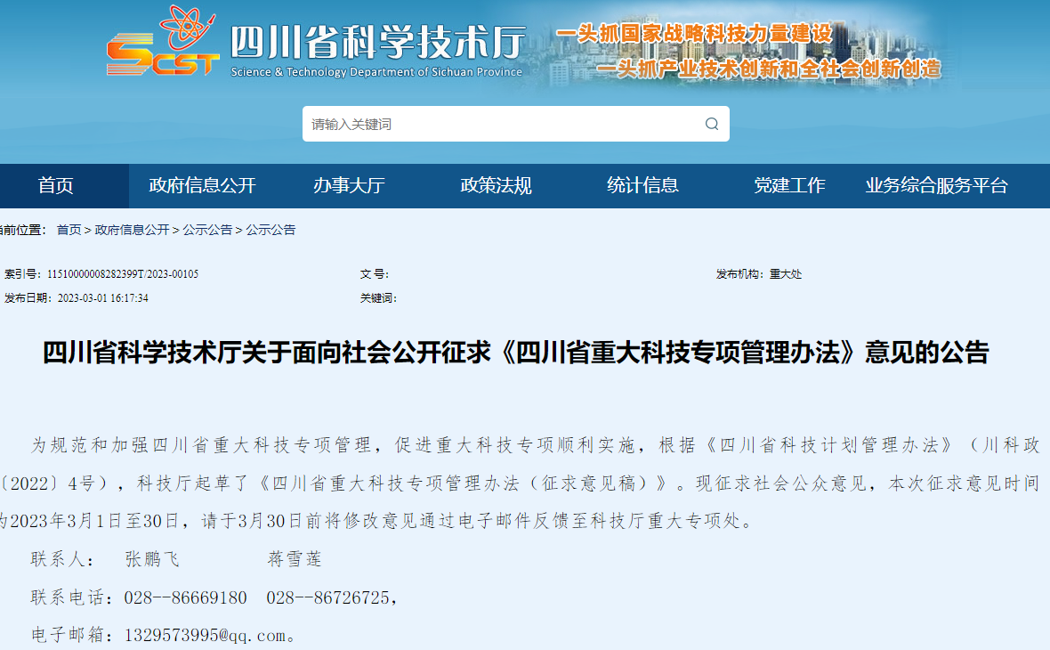 四川省科学技术厅关于面向社会公开征求《四川省重大科技专项管理办法》意见的公告