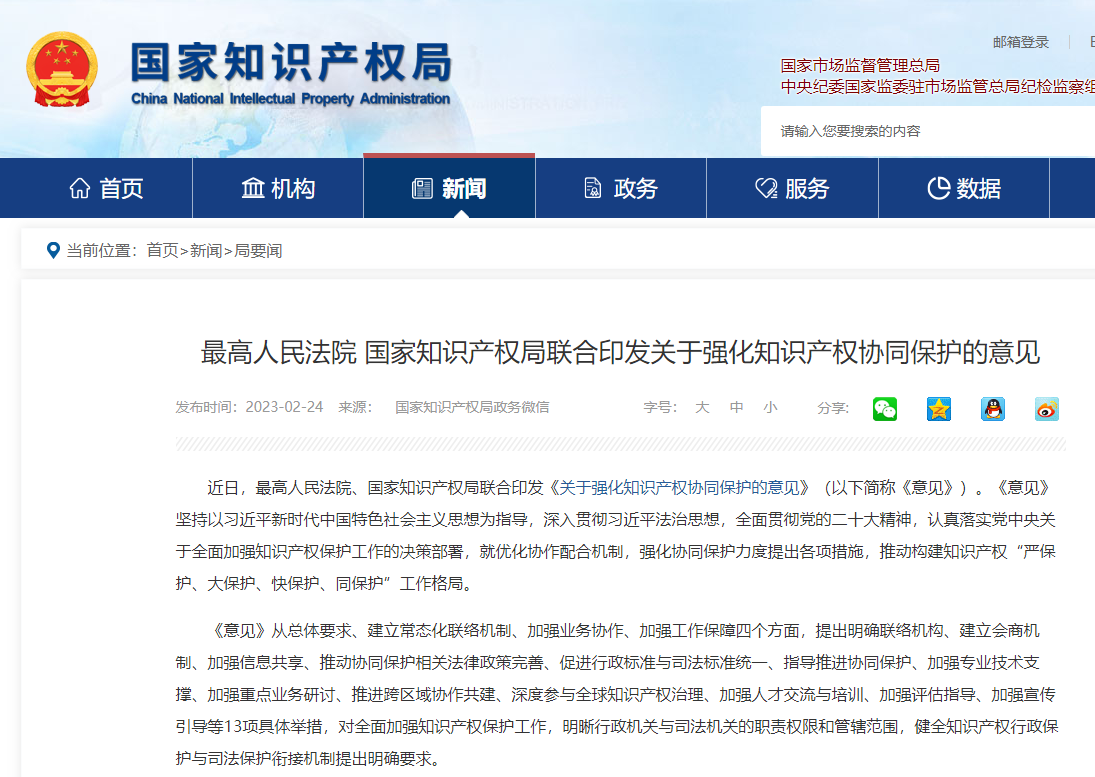 最高人民法院 国家知识产权局联合印发关于强化知识产权协同保护的意见