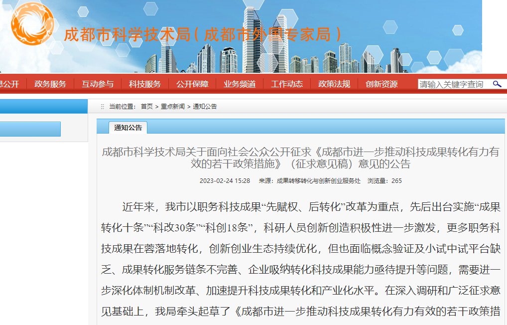 成都市科学技术局关于面向社会公众公开征求《成都市进一步推动科技成果转化有力有效的若干政策措施》(征求意见稿)意见的公告
