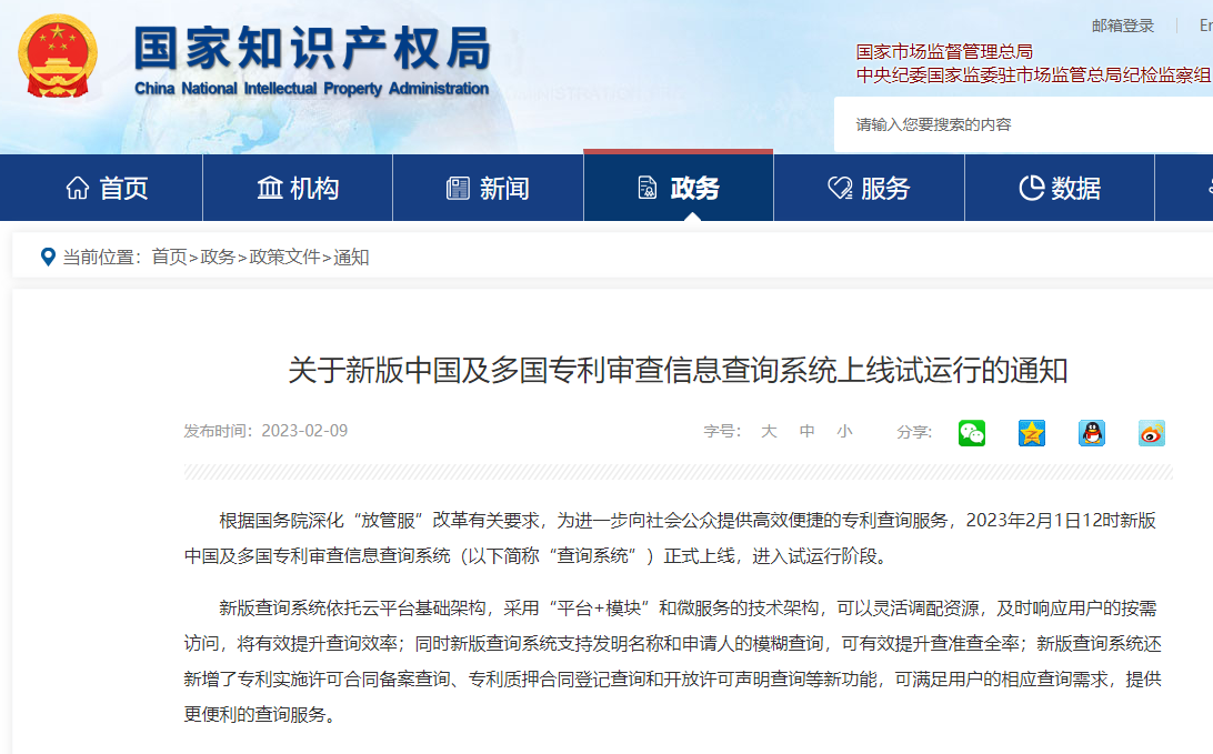 国知局:关于新版中国及多国专利审查信息查询系统上线试运行的通知
