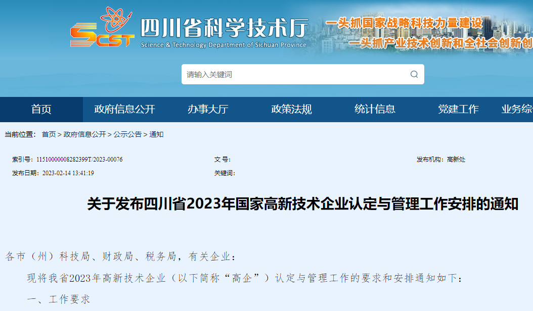 关于发布四川省2023年国家高新技术企业认定与管理工作安排的通知