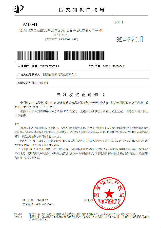您于2022年申请的发明专利:“休闲卡座" 专利申请号:“202230053578.9”。